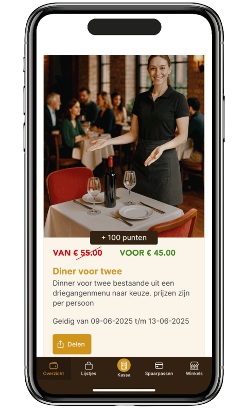 Informeer klanten over spaaracties, speciale aanbiedingen, trends, evenementen en activiteiten. Hoe meer spaarders, hoe groter het bereik van jouw advertentie.
